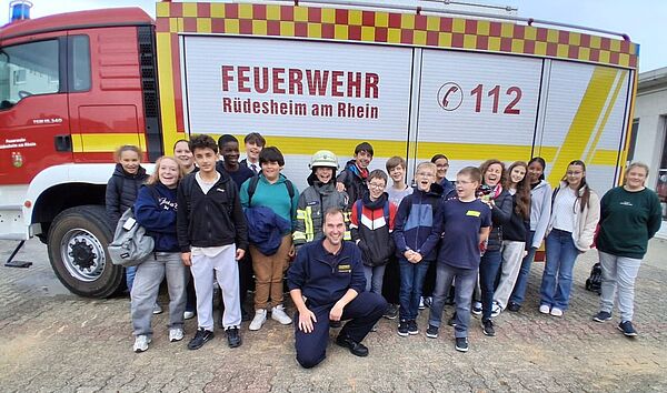 An ihrem letzten Tag im Rheingau erhielten die Gäste einen Einblick in das deutsche Feuerwehrsystem bei einem Besuch der Feuerwache in Rüdesheim. Der Leiter der Feuerwehr-AG der Hildegardisschule, Manuel Münz, hatte diesen Besuch am Feuerwehrstandort Rüdesheim Kernstadt organisiert. Von ihm erfuhren die Schüler/-innen viel Wissenswertes über die Feuerwehr in Deutschland und durften auch praktische Erfahrungen machen. Mit großer Begeisterung übten die deutsch-französischen Tandems den schnellen Löschangriff inklusive Wasserabgabe.